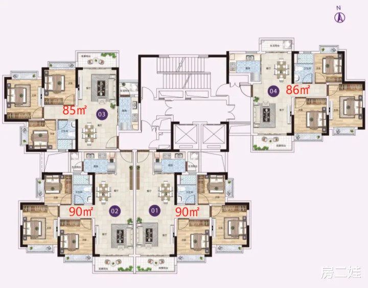 其中,22-23栋的约85㎡户型为北向3房1卫;86㎡和90㎡户型,为南向3房1卫;